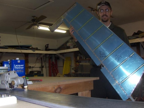 1/27/2008 Rudder trailing edge - 4 hours I spent quite a while today routing out one of my work tables to install the full-length back rivet plate that I made. I routed a 4" x 75" space in the table and it took forever! I started routing in the shop, but routing MDF creates a TON of dust, so I took the table outside to finish. Now I need to REALLY clean the shop again. Anyhow, it turned out great: