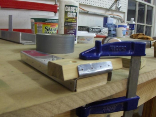 I cut a few pieces of wood and clamped everything to the table like so. I tried whacking it with my mallet, but ended up using the rivet gun with the flush set - that worked really good for tweaking the bend.