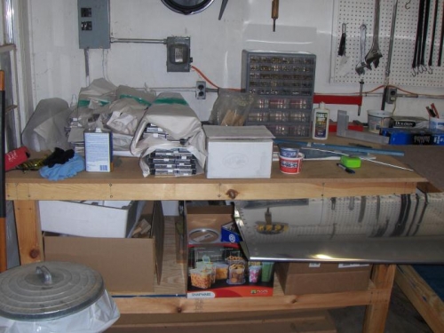 2/20/2008 Unpacking Wings - 2 hours I spent my evening thinking about how I want to re-organize the shop and getting started on it. I went by Home Depot and got a 30-something drawer organizer, so now my rivets are moving out of Feta Cheese containers and into a more organized setting. Amazingly, I think I'm going to have to buy another one of these organizers to have room for the non-rivet hardware. You can see the organizer here on my now very "busy" work table amongst ribs and boxes and bags:
