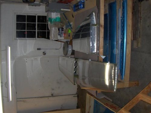 I pulled all the blue plastic off of the tail surfaces and wiped them down good with lacquer thinner. I used a piece of conduit and rolled the plastic off. They sure are pretty. I started moving them up into the attic. I put tape over holes where creatures could get in, and am laying them down on pieces of carpet and moving blankets.