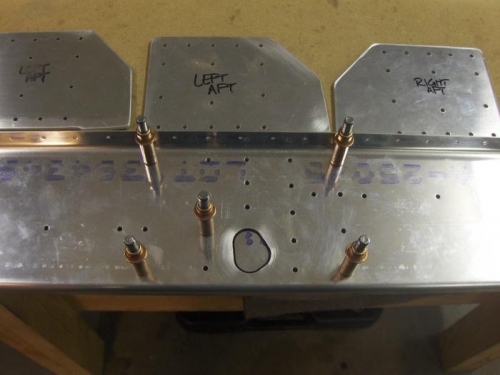 3/21/2008 Rear Spars & Ribs - 4 hours Today I finished the holes for the aileron push tubes in the W-707E doubler plates. I used a unibit backed up with a 2x4 to make a bunch of holes, then finished the holes off with files / emory cloth / scotchbrite. Each hole took about 20 minutes. I then deburred an dimpled in a few locations that need it. All the top flange holes on the rear spar that are above the reinforcement fork got drilled and dimpled, as you can't reach these once the fork is installed. I dimpled the top flange of the W-707E & F doublers and the corresponding holes on the top spar flange as well. I also dimpled the four most outboard holes on the spar and W-707F doubler instead of machine countersinking. Then I primed all the necessary places.