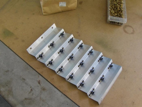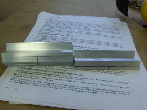 7/31/2008 Tank Z-Brackets - 2 hours I have decided to use the Dan Checkoway method for fabricating my tank attach z-brackets. I marked six of the brackets with a centerline offset 1/16" toward the web (for the six most-outboard brackets) and one bracket with the centerline offset 1/16" away from the web (for the most-inboard bracket).