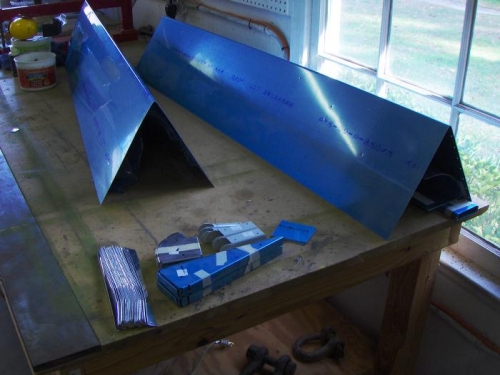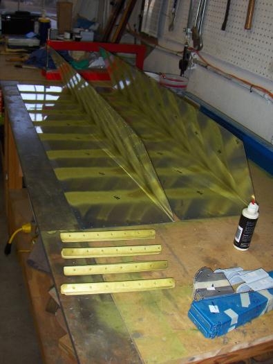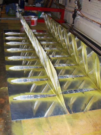 11/30/2009 Ailerons - 3.5 hours Yesterday I got some unexpected time in the shop. I was solo, so I couldn't start riveting wing skins, so I decided to pull out the ailerons. I actually started the ailerons just over a year ago, on November 23, 2008. Back on that day I cut out all the stiffeners and shaped them. Yesterday I pulled blue plastic off the skins, match drilled, deburred holes and edges on the stiffeners and the skins, dimpled stiffeners and the skins, and primed everything. Next solo session I can rivet the stiffeners on.