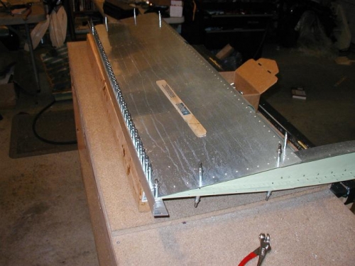 This went very well with the skin held open. It is clamped to the table as before but this time the top skin was held open with string from the trailing edge to screws on the edge of the table. Went perfectly. This was much easier than trying to work with the skin mostly closed with rivet gun pointing down instead of forward as would be for this method.