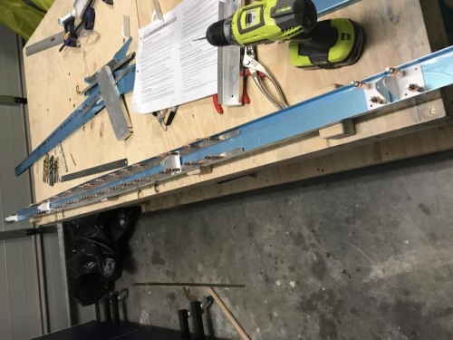 Continued work on the horizontal stabiliser after buying some number 30 drill bits and receiving clecos in the mail last week. Completed the rear spar up to the point of deburring and priming which I can only start when I have bought primer and a fresh air respirator. Started on the front spar drilling out all the required holes and attaching the various elements of extruded ali which also was required to be bent to 6 degrees in the bench vice (which went surprisingly easily).