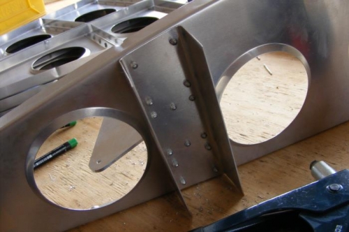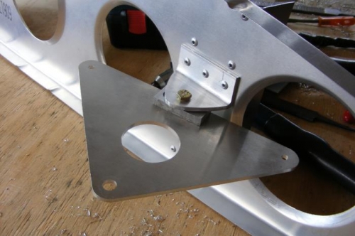 Fabricated the aileron bell crank hinge with an angle grinder and files. Drilled out the hinge on the drill press and final riveted the hinge on one side to the upgraded frame. Went well with nice tight tolerances (1.6 cm spacing). Still got the other side to do.