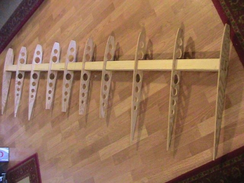 Removeed staples from 2nd spar web and trimmed 4 center ribs for anti servo tab. Marked spar for rib locations. Dry fitted ribs on spar. Had to trim a few .001" from spar holes on several ribs. Marked spar and ribs so the go on the same way when glued up.