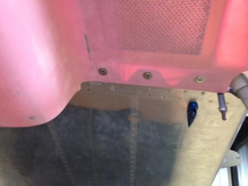 I added the Skybolt fasteners on the bottom cowling on both sides of the exhaust exit. I install three on the left with the center fastener a little closer to the exhaust opening for added support in that area. On the right side I installed two fasteners. The center flange will be pressed into other duty.