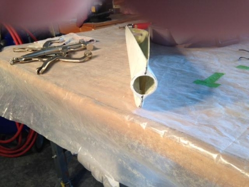 Second problem was mounting the aft position / strobe light. I needed to drill a 1.4" hole in the aft portion of the lower rudder. I used a 1 3/8" hole saw and then my dremel tool to sand it to the size I needed. I still need to fabricate a small mounting backet to epoxy to the end of the fairing. The light will screw into the bracket. Image two is the bracket that holds the light cover to the light housing. It is a good model for the bracket I will make for the fairing. I need to find a piece of .125X3"x3" aluminum to cut a bracket.