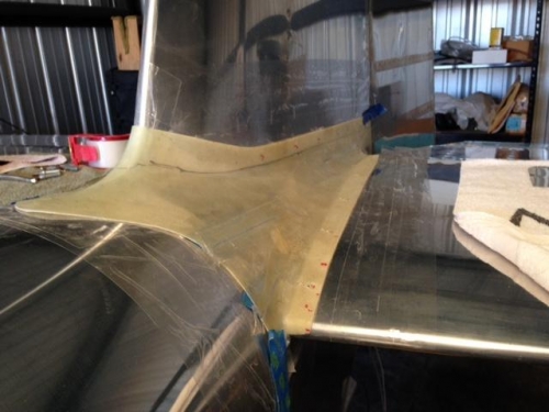 When I thought I had it where I wanted I layed up several 1" strips of fiberglass tape (10% I think.) When it curese the fairing should hold its shape well enough that I can do a couple of layups on the bottom side. After everything cures, I will sand, sand and sand some more and then check the fit. I think this is going to be a several hour process