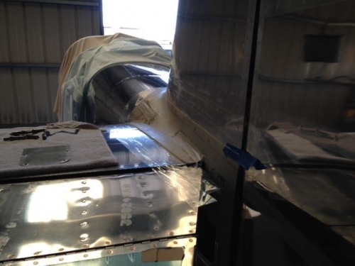 After getting the fairing about how I wanted it, I pulled it off and put release tape on the bottom, I did not want any epoxy dripping through onto the fuselage. I also covered the inside of the tail with plastic to make sure nothing got covered in epoxy.