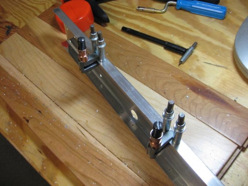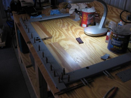 After finishing the top portion of the bulkhead I drilled to size four nutplates for riveting. Then it was disassemble everything and finish prepping for primer. Sanding, dimpling, countersinking, etc etc. I finished up by priming all the various pieces with zinc chromate and let them dry. The primer dries fairly fast, so while it was drying I was reviewing the next step to cut the slots for the locking fingers of the canopy. After the primer dried I waste the time to cleco everthing together. Sometimes its good to the see the part together before it is riveted. Next time its the slot for the canopy locks and then rivet everything together and I am finished with this bulkhead.