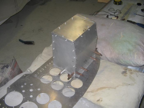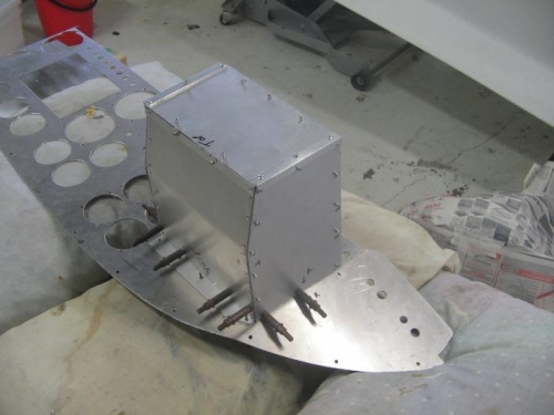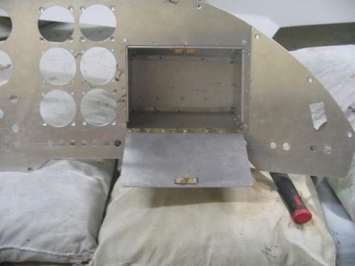 Constructed glove box compartment. Had to add slight angle down at rear of box to clear nose deck. Used solid rivets for attaching box brackets to panel and wait until the panel is painted before riveting box in place.