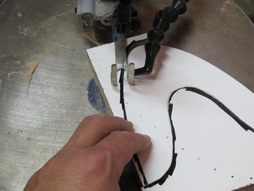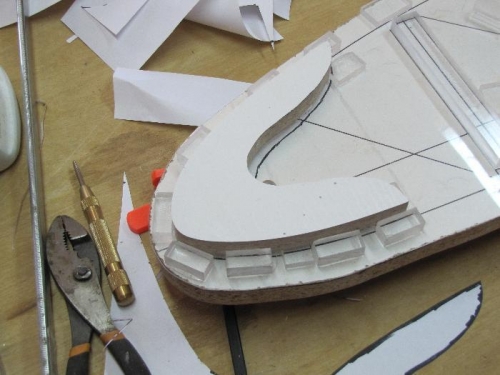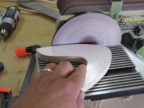Well tonite i made the leading edge form to be able to cut out the leading edge ply gussets. I had to remove the acrylic sheet from the jig to get the proper shape of the leading edge. It was easy to just remove the screws,slide the acrylic back, draw the outline of the airfoil on a sheet of paper layed over the jig and then screw the jig back down. I then cut out the shape on the paper and overlayed it on a piece of MDF. Redrew it onto the MDF and made a rough cut. After getting the basic shape, the hard work began. I started to sand the MDF on the disc sander getting as close to the line as possible but not over sanding. Once i got close to the shape i needed i would sand alittle, place on jig to check fit, then sand some more. Check on the jig, then sand some more. I did this about 100 times. They say "Patience is a virtue". If i wasn't having so much fun i would have gone insane. I almost had a perfect fit but had to quite for the night. I'll finish it tomorrow.