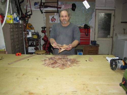 I cut out all the triangle gussets today. All 536 of them. I first cut thirty four 2 3/4' x 24" out of the 2'x4' pieces of 1/16" plywood. Then i cut those pieces down to 2 3/4" square pieces. and finally crosscut those into the final 536 triangle pieces.