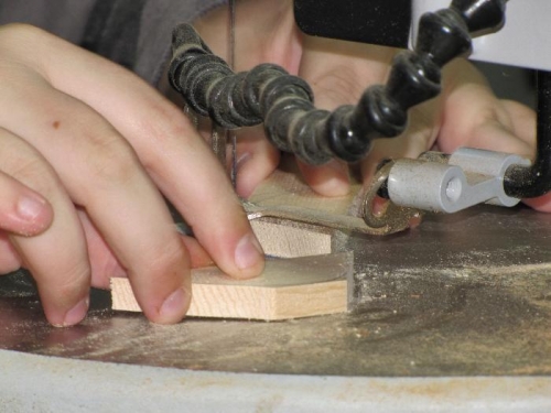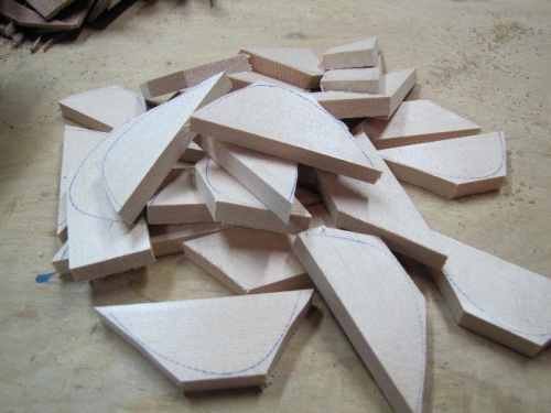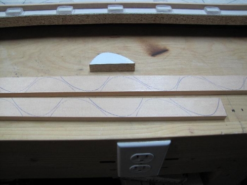 After finishing the leading edge ply gussets i started on the leading edge filler blocks. These are small nose shaped pieces that go between the the two leading edge ply gussets at the front of the rib. I used the form i created to draw the shape onto some 3/8"x1 1/4"x48" spuce pieces. I took about 1 1/2 pices to make 28 pieces. I then rough cut out the pices on the scrollsaw. I nailed one onto the form and routered it to the same shape. I came out looking pretty good, however i could not remove it from the form without damaging the pieces. I did two pieces with the same results. Hmm.... had to think about this. I then nailed two 1" nails through the form and they stuck out the other side about a 1/4". Then i placed the form with the nails pointing into the spruce and hammered them together. I routed them just like before. When it came time to seperate them it came apart fairly easily. I did a couple more. Same result. Seems i found a good method. Now to router them all. But as usual i'm out of time today. I'll finish the rest as soon as i can get back to it.