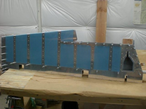 Anyway, began working left elevator by drilling E 610 & 611 to the E702 spar. Drilled E703 & 704, clecoed and E713 to E703 & 704 and clecoed to spar assembly. Installed E714 lead weight and drilled. Match drilled all holes of counterweight assy to spar. Clecoed and match drilled E606PP to E705 & 702. Drilled E701 skin to skeleton. Disassembled all skins and parts for left elevator and deburred. Countersink E714 and dimpled all parts and skins.