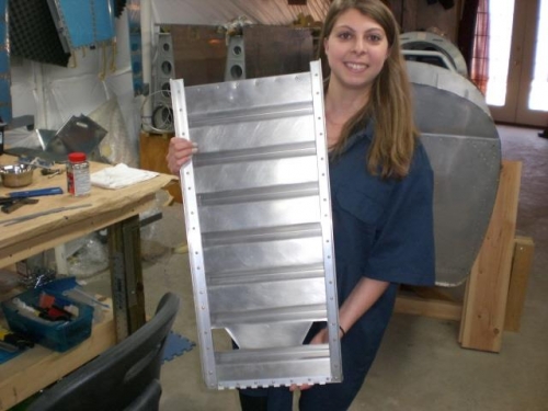 So we went down to the shop and planned on doing the seat back. I was amazed at the natural ability she had to learn the process and become proficient at it so quickly. We back riveted, used the rivet gun, and used the squeezer. She did amazingly well and riveted the whole thing together. During the work session my son-in-law David came down to the factory to see what was going on. Well he volunteered to help and we really made time by clecoing, drilling and deburring to get ready to do the riveting. Unfortunately he and Jennifer had to leave to head back to Buffalo. It was awesome to work together on the project. Another piece completed.....and now Christina is affectionately refered to as "Rosie".
