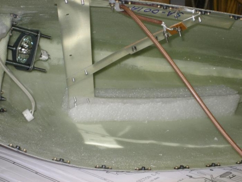 Mounted com antenna in left wingtip. Bent in vertical direction and held in place with foam block.