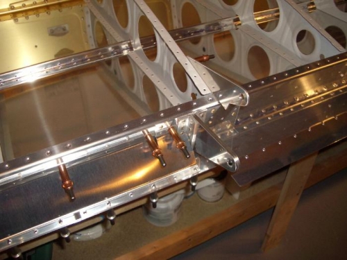 Almost finished back-riveting top skin to left wing.Finished drilling and deburring hinge bracket assemblies to left wing. Riveted flap hinge brackets to right wing.