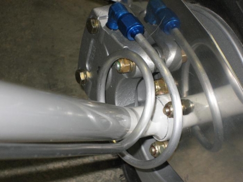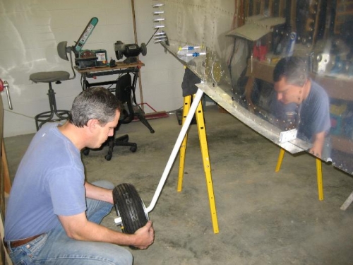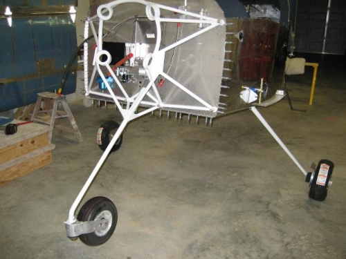Drilled main gear cotter pin holes. Finished mounting wheels, brakes, and wheelpant brackets. Mounted nosegear and front wheel. Started working on wheelpants.