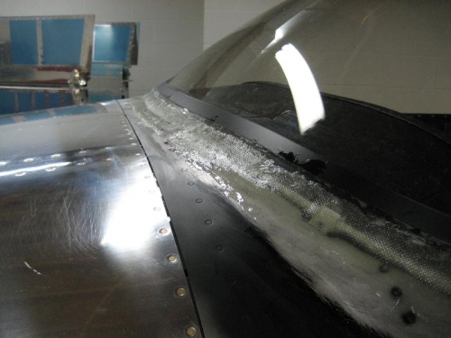 Scuff sanded canopy edge and canopy skin. Cut strips of fiberglass from 1/2" wide to 2" wide. Layed up seven layers of fiberglass to form canopy fairing.