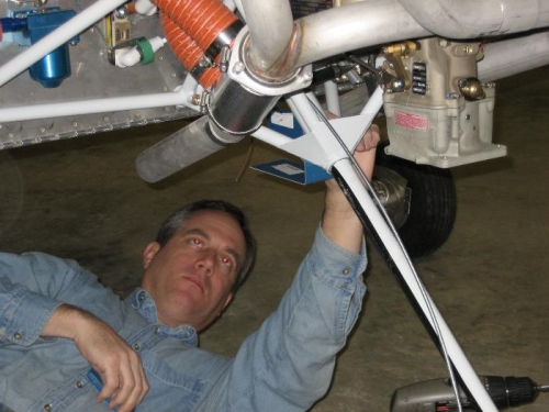 Removed and cleaned clecoes from cowl and hinge halves and cleaned epoxy from rivet holes. Fabricated and assembled cowl bracket that supports split in lower cowl.
