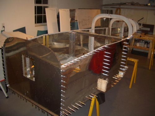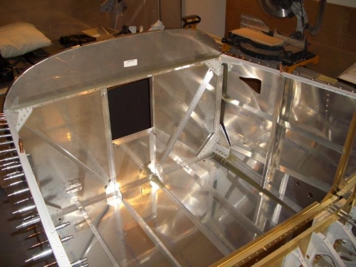 Finished riveting forward bottom skin to stiffeners and firewall. Finished riveting side skins. Flipped fuselage over and admired.