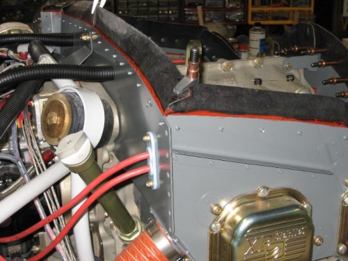 Finished riveting and sealing baffling. Cut hole in right air inlet floor for alternator cooling blast tube.