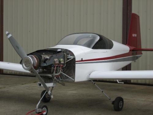 Masked and painted stripes on cowls. Installed horizontal and vertical stabilizers and rudder. Instlaled wings.