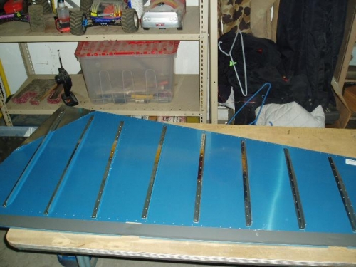 Dave and Dan fitted the ribs to rudder skin and drilled out holes. The need arose to repair a slightly damaged skin, but everything else worked good.