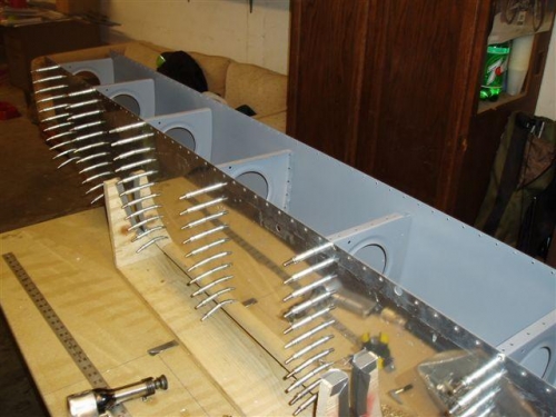Today we riveted the leading edge together. Also dimpled and primed the top skins. Riveted leading edge to wing.