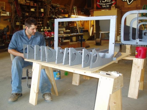 Today we dimpled the skin for the bottom of the center section. Primed the skin and touched up the light spots on the seat and baggage ribs. After everything was dry we riveted the skeleton of the center section.