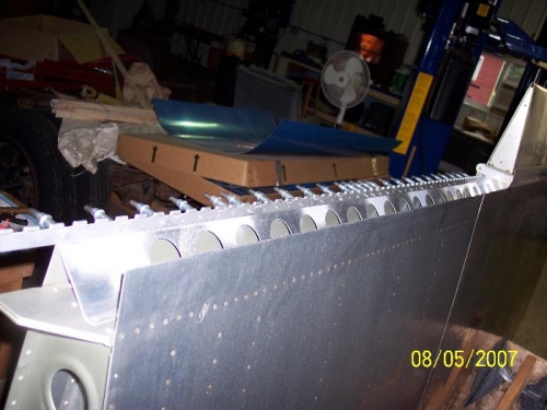 ‪Fitted left flap to wing using MS20257-4 hinge on wing to obtain better allignment with aileron trailing edge. Drilled holes in hinge, disassembled, deburred and clecoed to wing.