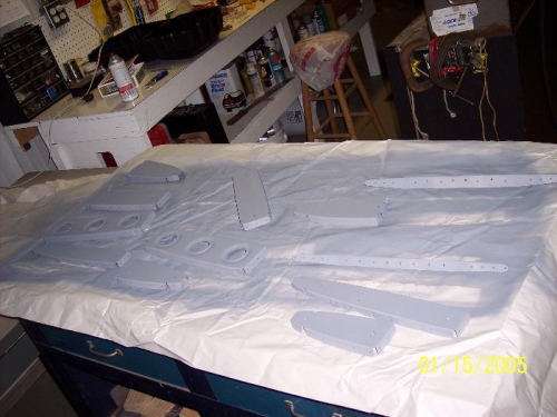 Selected left and fight ribs. Drilled holes in HS-405 that attach to the fwd spar. Primed all parts in horiz stab skeleton with NAPA 7220 primer.