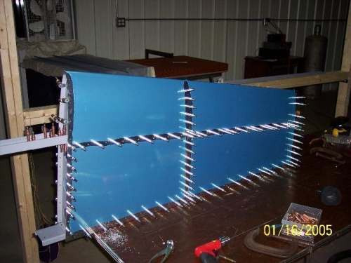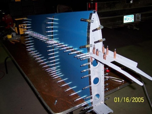 Selected left ribs and spars for horizontal stab and clecoed together. Drilled rib to spar attach holes per instructions. Clecoed HS801PP skin. Prepared and fitted HS404 and HS 405 ribs per instructions and drilled holes in flanges using skin as a guide. Drilled skin attach holes in fwd spar. Drilled remaining holes for HS-405 and HS-404 which included holes for HS-811-1 and HS-814-1.