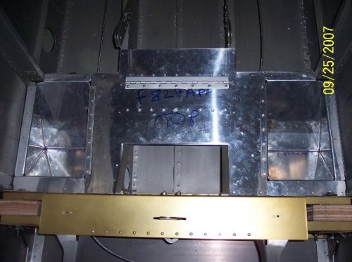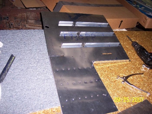 Match drilled, deburred, dimpled and riveted F-829 fwd floor and rear footwellls together. Match drilled, deburred, dimpled and riveted stiffeners to F-830L floor, except for the front ones. Drilled holes in rear seatback attach hinge.