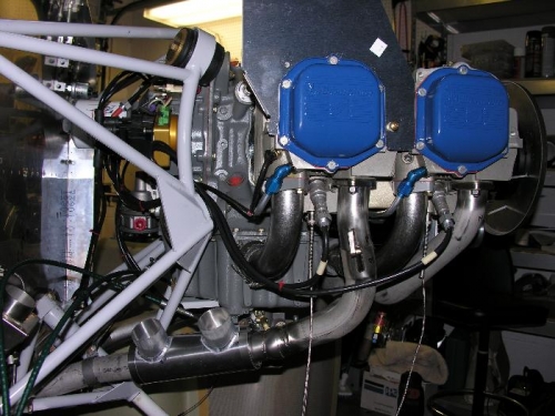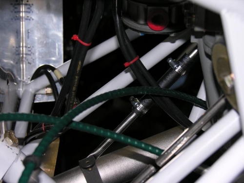 Finished cutting the stainless steel hanger rods for the exhaust system using a cut off wheel. It was no problem. Installed the connection between the two exhaust pipes just in front of the nosegear.