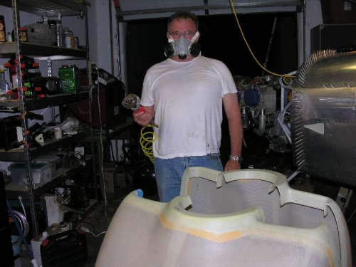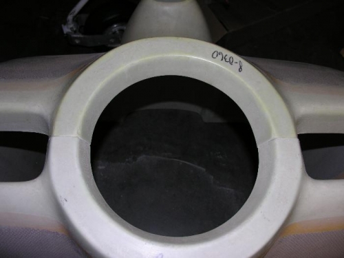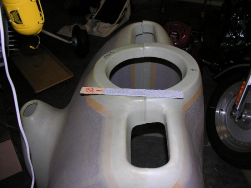After reading lots of advice on VAF regarding the cowl, I fit the two halves together off the airplane and began the trimming. I put the two halves together with the spinner area up and the aft ends resting on the shop floor. I made a sanding tool out of a paint stirrer with 60 grit sandpaper glued to it on both sides. I also used a flat file.