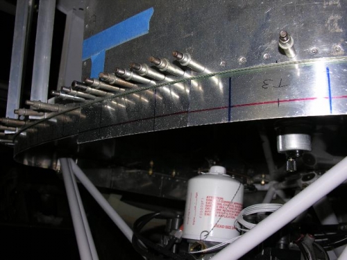 I mentally confirmed the layout of the fasteners on the mounting strip. I will have to move the fastener positions on the top engine mount area down .250 to make sure they clear the mount. The position of the fasteners with respect to the joint between the upper and lower cowl works out just right.