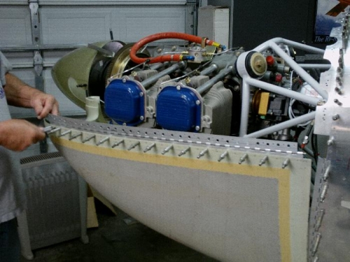 Lawst night I drilled on the hinges to the lower cowl halves. Tonight I riveted the lowe cowl halves hinges in place. I also used MA 310 Adhesive that I bought from Jamestown to fix the hinge to the cowl. I drilled 1/4 holes in the hinge as per plans to provide an area for the adhesive to bond.