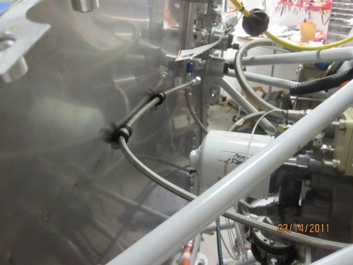 Attached the fuel hose from the fuel injector body to the spider. Considered with Dick Isherwood how to install the fuel flow sensor in that line. I later found the installation instructions that came with the fuel flow transducer that indicates that it should be installed between the mechanical fuel pump and the fuel injector body, which is inconsistent with what I have read widely elsewhere.