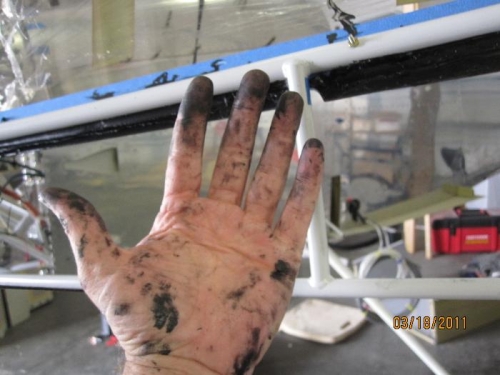 Applied the sika flex to the canopy and frame. The canopy had previsously been "tacked on" to the frame by a small amount of sika flex to hold it in place while the main application of sika flex took place.