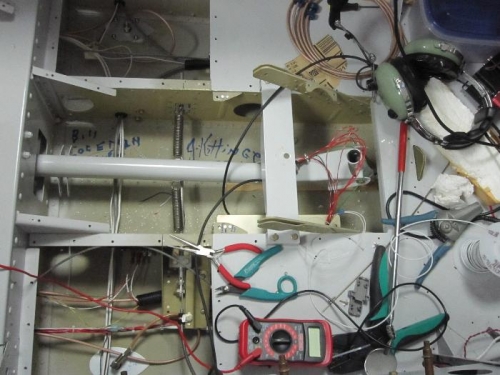 Using the testing meter, I determined that the grn/blk and grn wires loose behind the panel go to the stick switches. My notes tell me those are both for the engine start function. I labeled them.