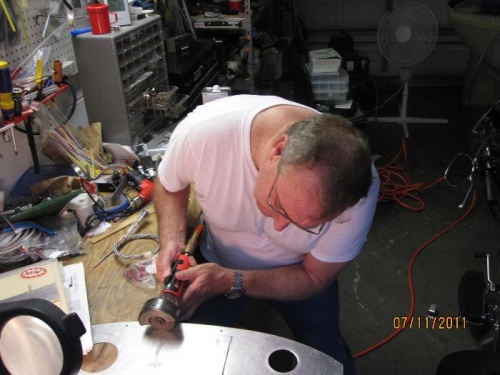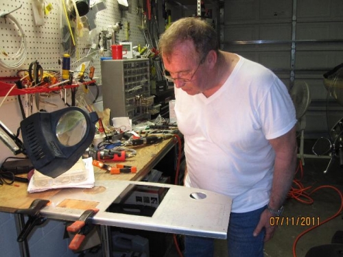 Dick Isherwood came over to help. I used a die grinder with a cutting wheel to cut the EIS hole after Dick made the first couple of cuts to show me how. Then I cut the large hole in the middle for the GRT Sport and the air gizmo to hold the Garmin 396.