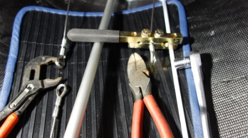 Installed rear rudder cables. The rear cable loops had to be compressed in a vice to get them to fit in the rudder control arm (6mm reduced to 5mm). Greased and installed the rear cable loops, used loctite 242 and red paint on the bolts. Put rudder jig back on rudder and stuck wood between the jig and the rear vertical stab to hold the rudder control arm centered. Installed swage rings and cable loops in rear fuselage, measured and swaged the first ring. slid the second ring off the looped part of the cable, cut the cable loop at the rear of the 2nd swage ring location using a Linesman plyers (a heavy duty wire cutter), slid the second swage ring back over the looped part of the cable lining it up with the freshly cut cable end and swaged it on.