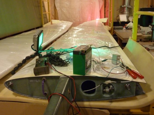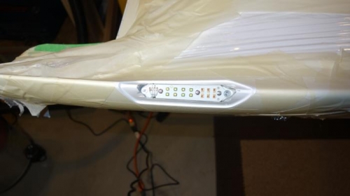 Used dremel to grind out pocket for left wing light. Drilled mounting holes, Attached wire and mounted light. Attached 4 wire molex connector on fuselage side, then connected light driver and tested light.
