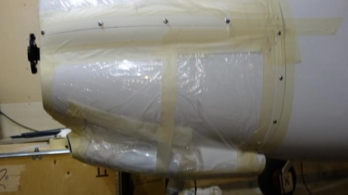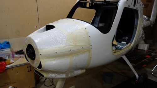 Attached cowl using masking tape. Made sure it lined up, Marked center hole on top cowl. Measured in 1/2 the distance of the mounting flange and marked the center mounting hole of the top cowl. Estimated where the bottom quick release screw on the top cowl should be positioned by looking at pictures I took of a Pipistrel Alpha trainer. Measured the distance from the center to the bottom screw and divided by 5 to get the spacing between. Repeated for the other side of the top cowl. Marked location for 4 evenly spaced screws on each side of the lower cowl, drilled 3mm holes with standard drill bit, then used step drill to increase hole size to 5mm (1mm larger than the screw size) on bottom cowl holes and 6mm on upper cowl holes. Removed the cowls, used 1/4 inch round file to increase hole size on upper cowl until quick release screws slide in and out easily. Used tapered (100 degree) grinding stone turning by hand to chamfer holes to prevent gelcoat from chipping. Enlarged the top cowl holes on the fuselage to 12mm with stepper bit, Used a 3/4 inch diameter round grinding ball to make the chamfer so the female portion of the quick release screws fit flush to the fuselage surface. Drilled lower cowl fuselage mounting holes to 8mm with a step drill. Ground out the back side of the hole so the blind nut will expand properly by attaching a 3/8 cylinder Dremel grinding attachment through the hole to the Dremel with the Dremel on the outside of the fuselage and the bit on the inside. Ground a flat bottomed round hole until thickness was about 2-3mm. Put a small amount of epoxy on blind nut (so they won't spin) and inserted and then compress them in the holes.