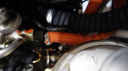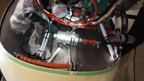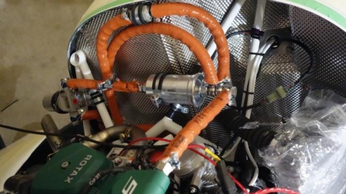 Started with the return fuel line from engine to firewall connection. Measured length by running fuel line from output of the fuel regulator to the firewall return connection, marked the line with a sharpie and cut the line with a sharp scissors. Then figured out where the pressure bleed-off return tee was to be located and cut the fuel line at this location. Cut the fuel line insulation slightly shorter length, worked it onto the fuel line and applied heat shrink tubing to the ends to hold it on the fuel line but then I could not get the hose clamps to fit over the fuel line plus the heat shrink tubing (they barely fit over the fuel line when opened to the last thread on the screw) so I changed my approach and removed the fuel line insulation (saved for shorter pieces) cut another piece of insulation slightly longer than the fuel line (so that the insulation will naturally expand and keep both ends of the fuel line covered) and cut a 45 degree corner off at each end to make room for the clamp. Worked this new piece of insulation on the fuel line, attached it to the engine and to the tee with the supplied hose clamps (using Loctite on the hose clamp screws). Repeated this for all the other fuel line connections, firewall supply connection to gascolator, gascolator to large fuel filter bypass and large fuel filter input, large fuel filter output tree to filter bypass, pressure bleed-off (making sure to connect it to the tree fitting with the small orifice in it) and engine fuel input fitting. Applied Loctite and tightened the large tree bolt to 25 Nm (after verifying the torque with Pipistrel) then safety wired the large fuel tree bolt to a hole that I drilled in the large fuel filter mount