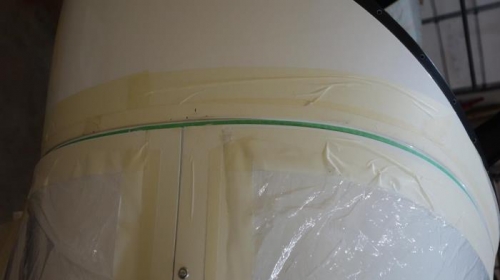 With a slot for the nose wheel cut, I started fitting the cowl to the plane. I attached the cowl with masking tape with it fitting properly in on the flange of the fuselage. The cowl was too long and the crank shaft of the engine was off center. I flipped the prop back plate around so that it would fit on the crankshaft with the cowl installed, I then moved the cowl until the prop back plate was centered on the front of the cowl. re-taped to hold and then measured the gap from the bottom of the fuselage flange to the back of the cowl every 5 mm or so all around. I then measured the gap between the front of the cowl and the front of the flipped prop spinner back plate. Using these measurements and the thickness of the spinner back plate when installed correctly (leaving a 10mm gap between the spinner back plate and the cowl). I transferred the measurements to the back of the cowl starting with the bottom of the fuselage flange to the cowl ever 5-10mm around the cowl. I then cut the cowl with a diamond Dremel disk on the line connecting these measurements and sanded smooth and re-installed. It came out pretty close. I then repeated this one more time (now with the spinner back plate on correctly and used my sanding stick to smooth out any place where it didn't follow the contour of the bottom of the fuselage flange. Rounded the edges to prevent gelcoat chipping and remove burrs. Sanded inside of the cowl at all contact points to reduce the chaffing of the gelcoat where the cowls are in contact. Re-installed holding the cowl on with tape for one last check for fit.